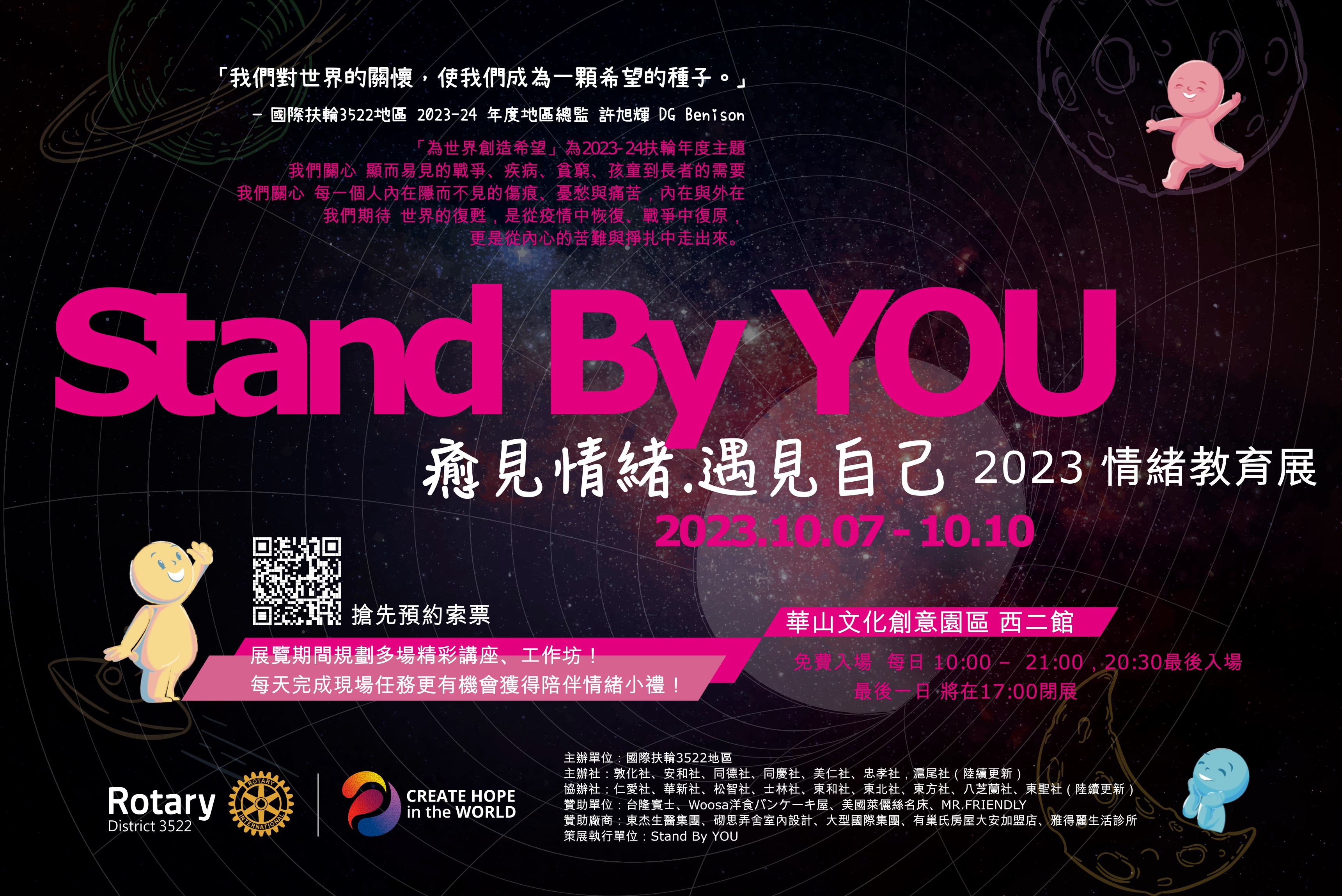 一、國際扶輪社為呼應2023年之年度主題「為世界創造希望」 特聯合民間團體,規劃辦理「療見情緒,遇見自己—2023 Stand By You情緒教育展」系列活動,期以初級預防教育 為目的,透過接納與包容,持續關注下一代內在需求議 題。