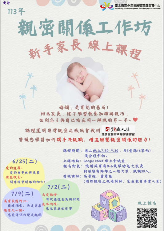 歡迎參加臺北市青少年發展暨家庭教育中心「親 密關係工作坊-新手家長線上課程」,學習傾聽、溝通 及經營婚姻的方法,和和樂樂共親職!報名請上網查 詢。