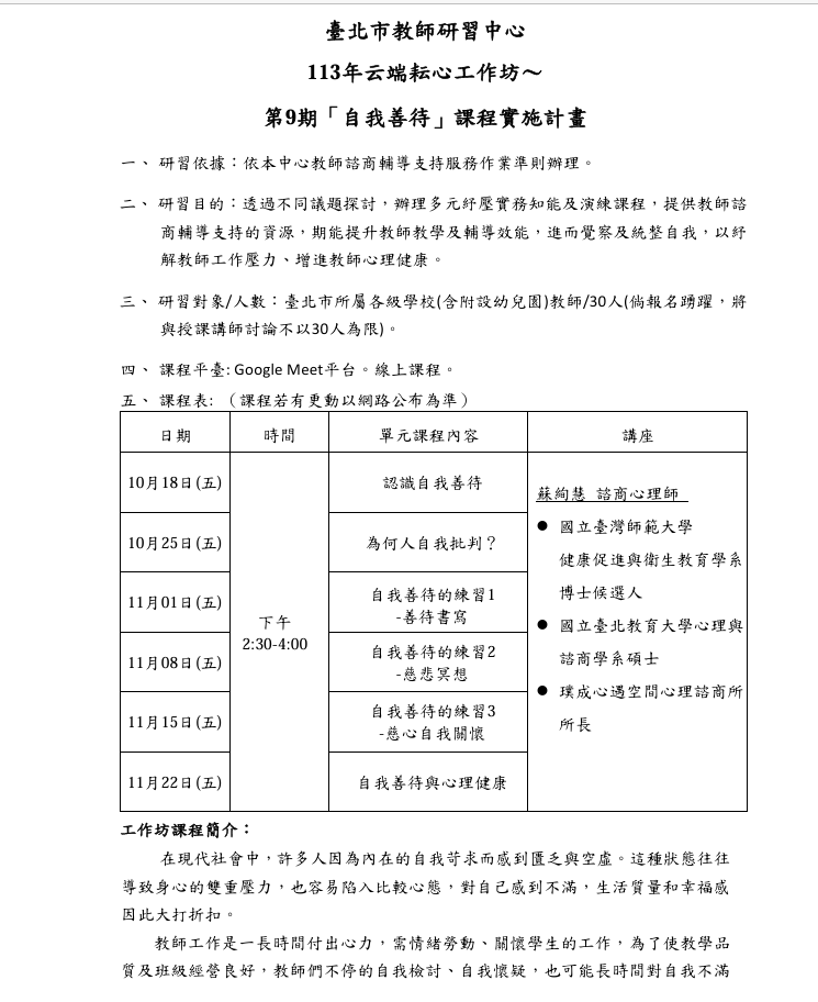一、依據教師研習中心教師諮商輔導支持服務作業準則辦理。