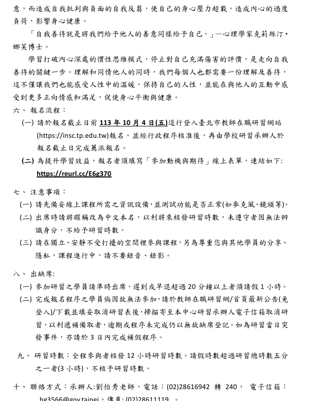 三、課程日期:113年10月18日、25,11月01、08 、15、22日 週五下午2時30分至4時整。