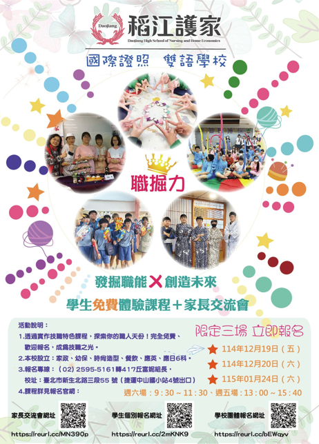 二、本學期於114年12月19日(五)、12月20日(六)、115年1月24 日(六)辦理「稻江護家職掘力實作體驗」,誠摯邀請八、九年級學生參加,並歡迎教師或學生家長共同參與。