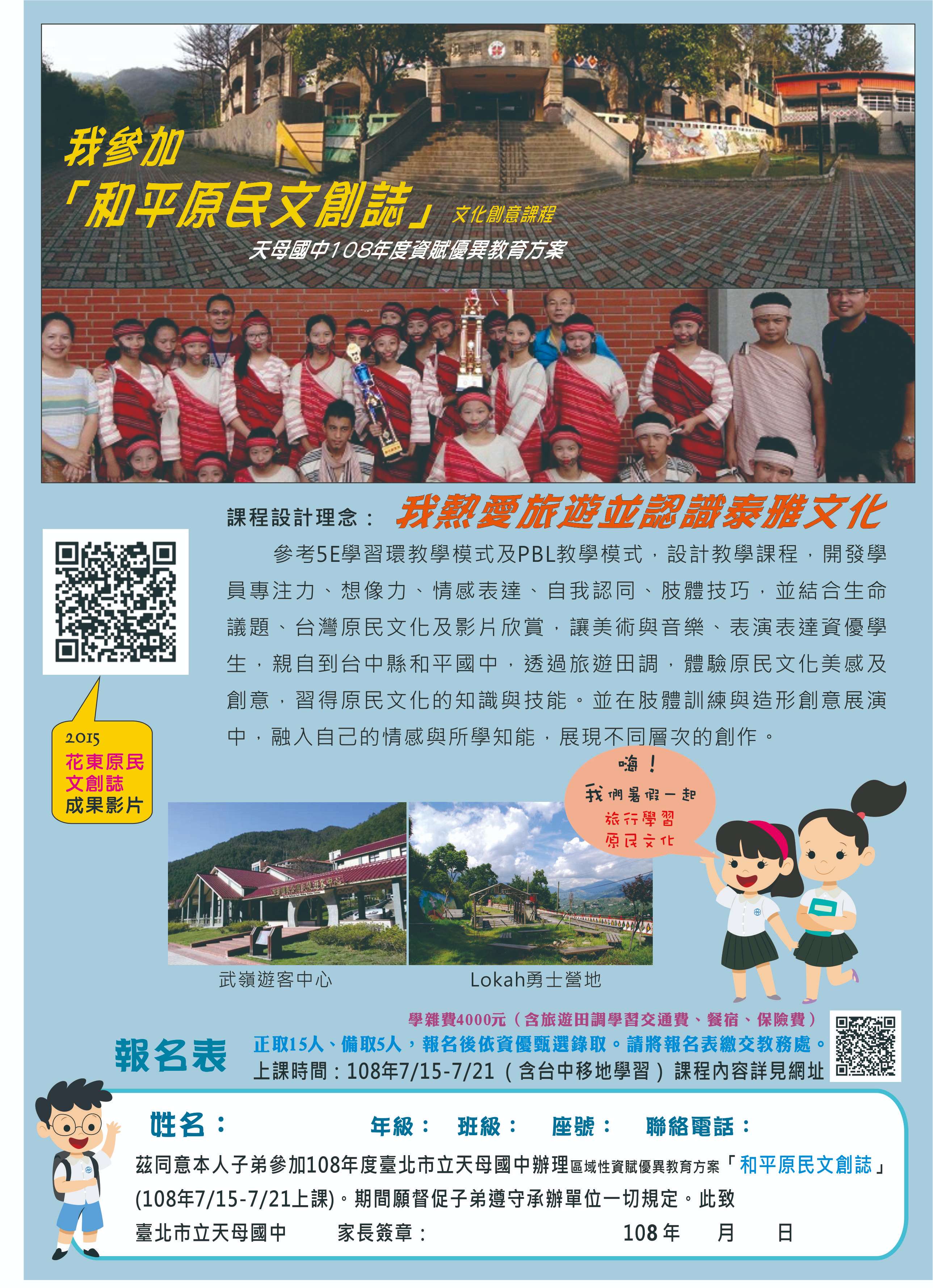 天母國中108年度區域資優教育方案-「和平原民文創誌」文化創意課程,延長報名日期至108年6月19日(三),歡迎大家踴躍報名參加。