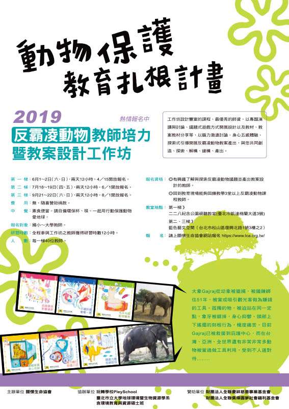 本會108年7月18日、19日(四、五)於台北市藍色藝文空間(復興北路1號3樓之2)舉辦「2019反霸凌動物教師培力 暨教案設計工作坊」第二梯研習。本研習核發研習時數12 小時,課程詳如附件,報名網址:https://www.lca.org.tw/news/node/7167,