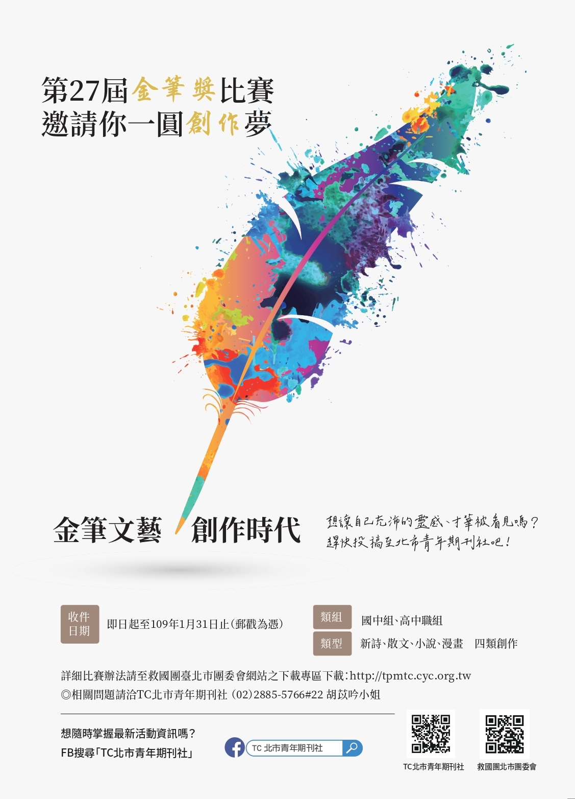 一、金筆獎創作比賽歷經27年,耕耘有成,茲係為倡導青年學 生寫作風尚,提供校園文藝創作平台,鼓勵青年朋友勇於 恢弘寫作、繪畫才華,提升全民生活美學、涵養,盼請共 同協助推廣,增進校園藝文風氣。
