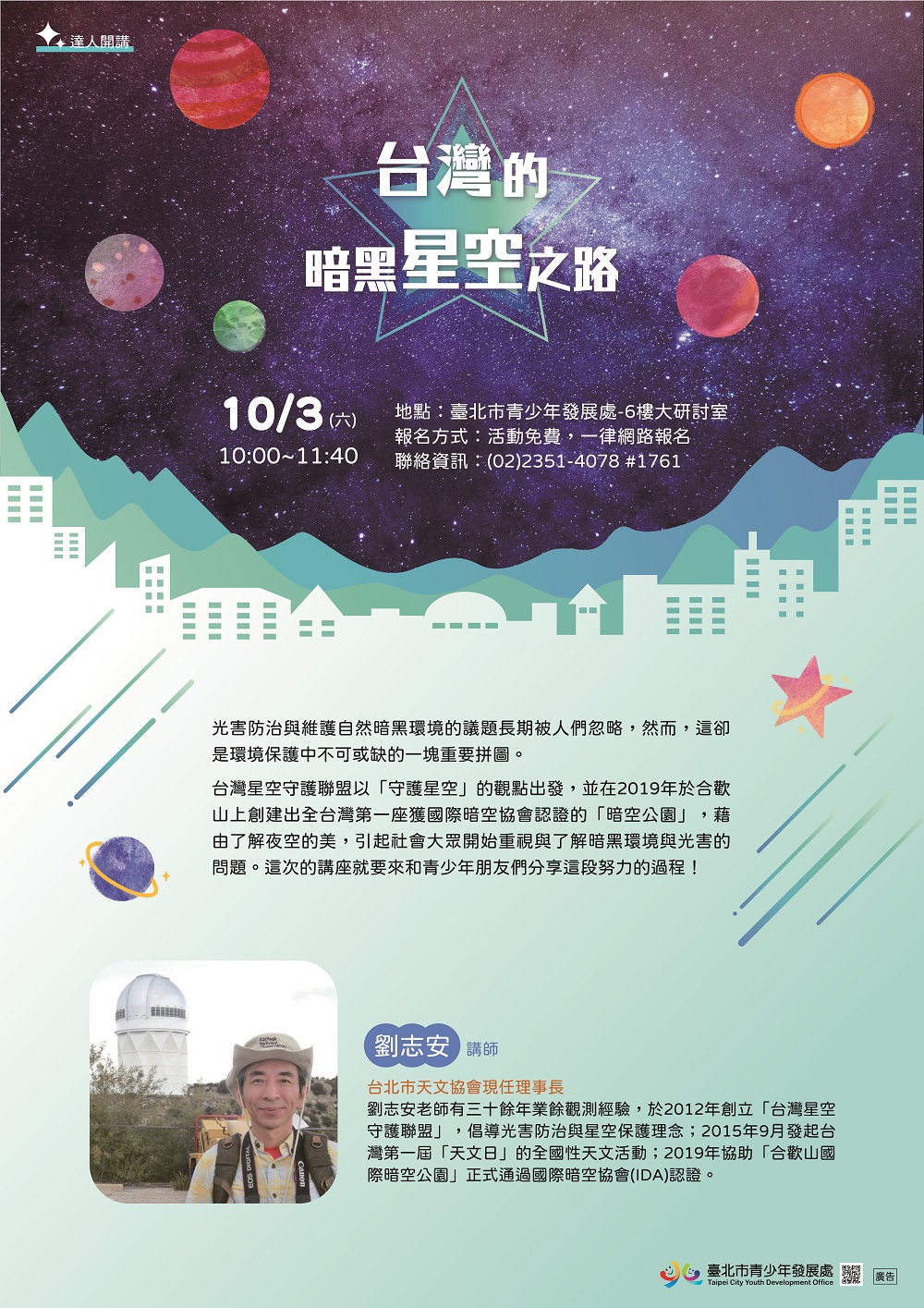 臺北市青少年發展處10月3日10:00舉辦達人開講 「台灣的暗黑星空之路」,劉志安與您分享創建出全台灣第一座獲國際暗空協會認證的「暗空公園」的努力過程!活動免費,詳見青發處官網。