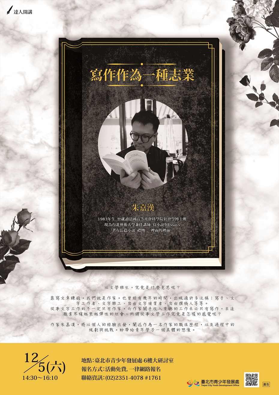 (一)90字:臺北市青少年發展處12月5日14:30舉辦達人開講 「寫作作為一種志業!」,朱嘉漢與您分享作為一名作 家的職涯歷程,期盼帶給青年學子一個具體的想像。活 動免費,詳見青發處官網。