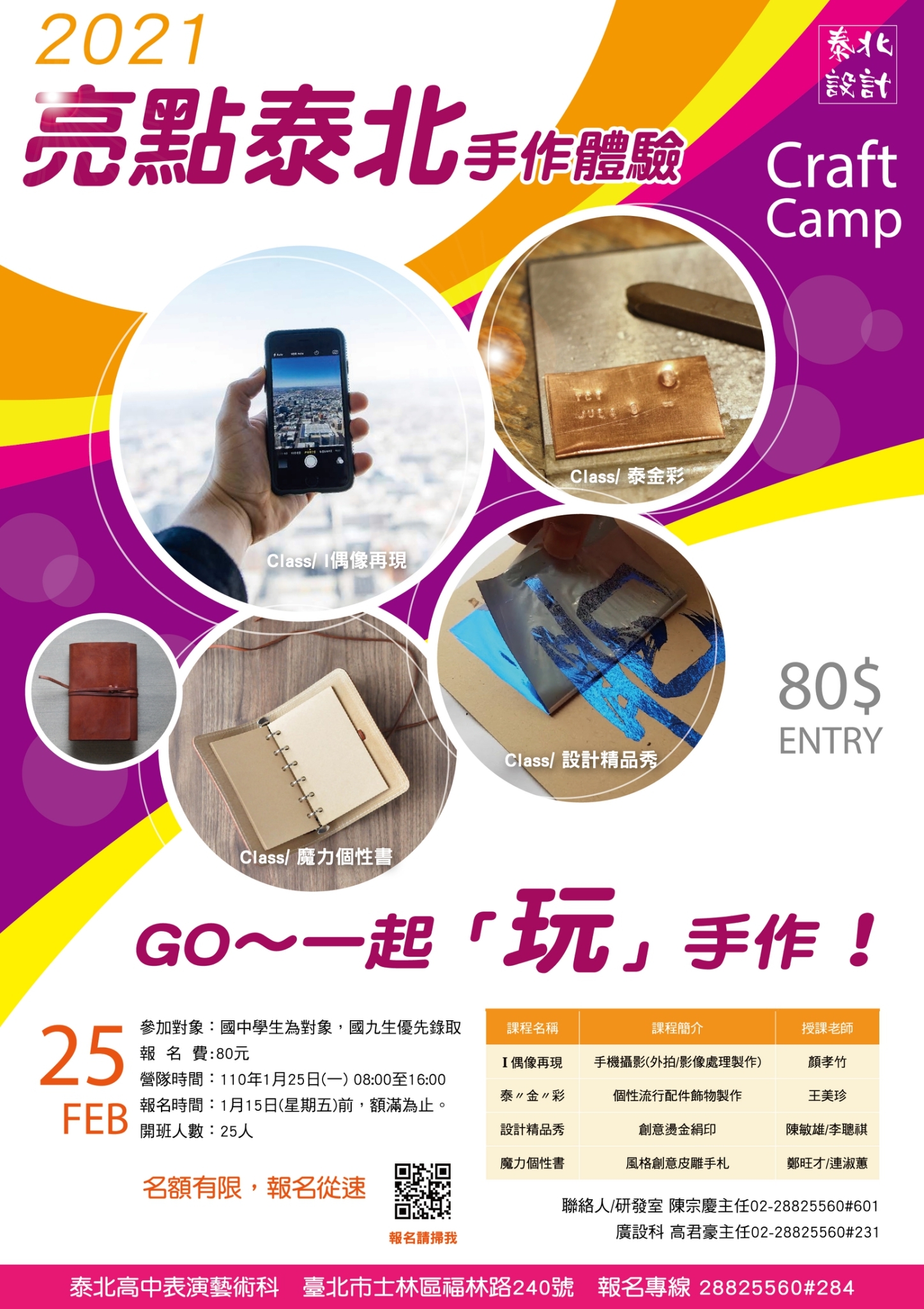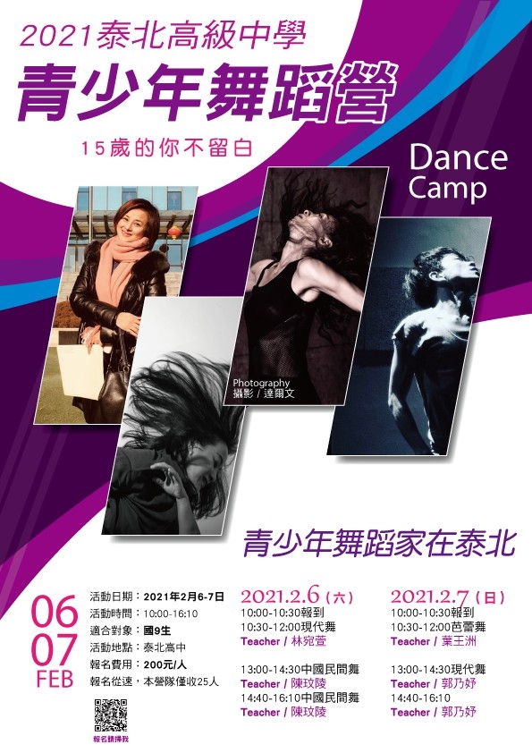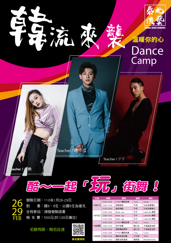 設計群科-亮點泰北手作體驗110年1月25日 (星期一)、表演藝術科-韓流街舞110年1月26日( 星期二) 至1月29日(星期五) 、青少年舞蹈營110年2月6日(星期六) 至110年2月7日(星期日)
