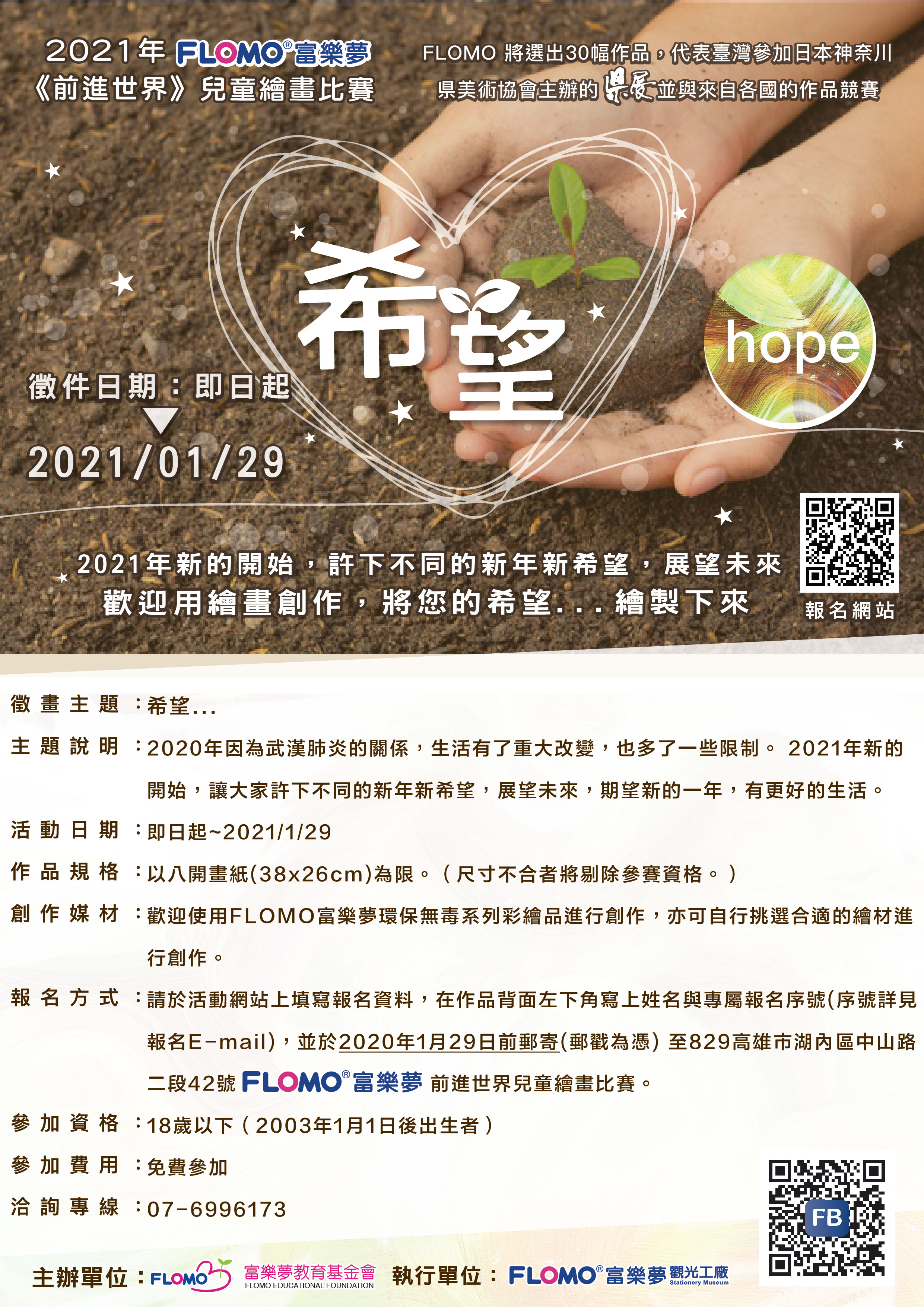 一、為讓臺灣孩子藉由畫作走出國門,前進世界,也讓世界感 受臺灣孩子豐沛的創作能量,FLOMO富樂夢自2016年起與日 本神奈川縣美術家協會主辦的《県展》合作,將臺灣徵選 的優秀作品送至日本展出,並與來自各國的兒童作品競 賽。截至2020年已有逾千位小朋友參加甄選,作品頗受日 本美術界肯定,數次奪得日本県展JUNIOR賞青少年獎等殊 榮。