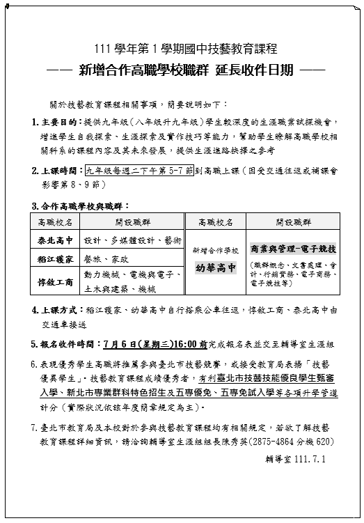 111學年第1學期國中技藝教育課程--新增合作高職學校職群.延長收件日--