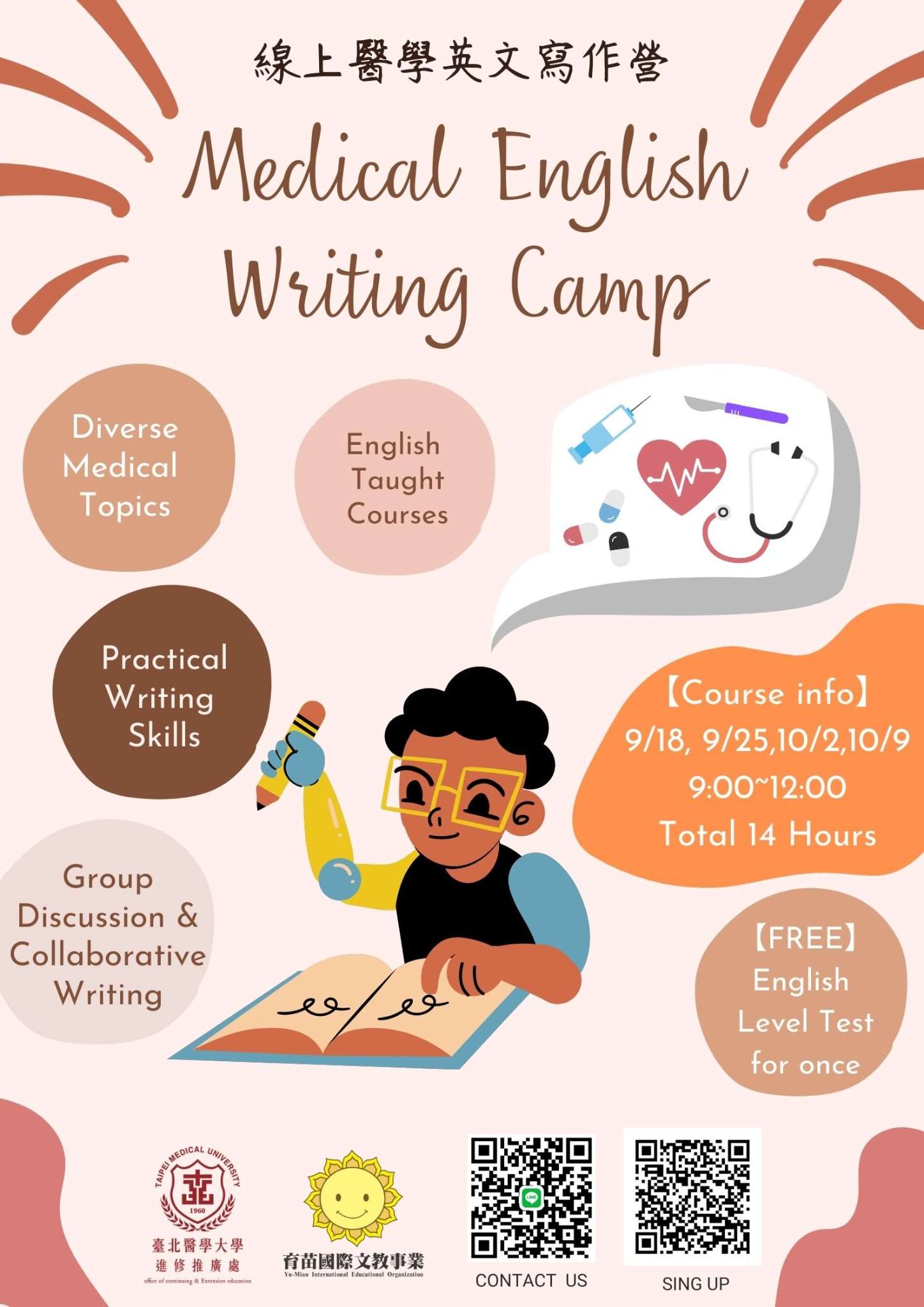 一、為促進學生對醫學領域之認知並有效提升英文實力,臺北 醫學大學進推處結合本校專業醫療師資、國際師資及專業 英文教育講師資源,採用營隊設計深入淺出的英文醫學寫 作課程,以遠距教學擴大學生之國際視野,並以實做練習 提升其英文寫作能力。 【課程日期】2022/09/18(日)、 9/25(日)、10/2(日)、10/9 (日),共計四天14小時。 【招募對象】全國高中職學生(含應屆畢業生)對醫學或英 文有興趣者。 【課程費用】8800元;學校推薦者或於8/31前報名者可減免 1,000元。 【報名時間】即日起~2022/9/10(六)23:59 止。