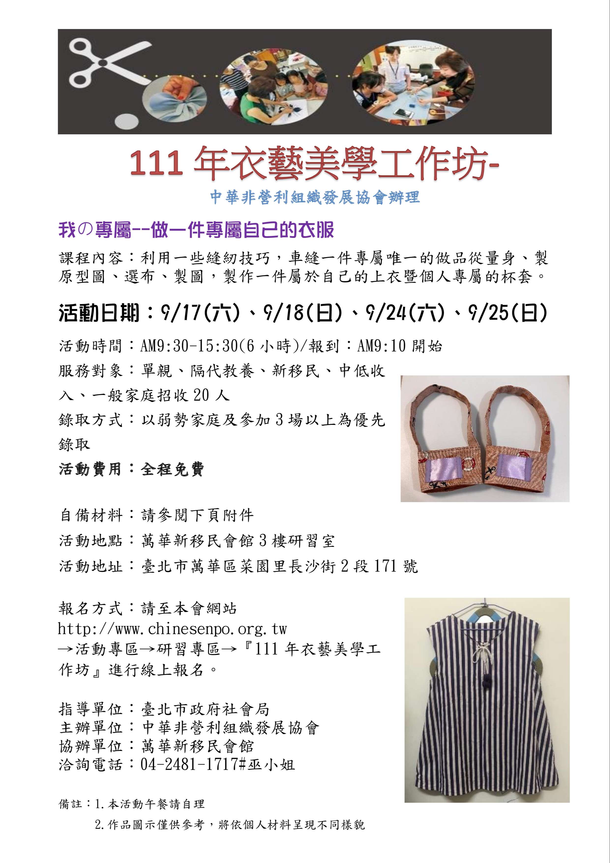 四、報名方式:請至本會網站www.chinesenpo.org.tw→活動專 區→研習專區→『111年度衣藝美學工作坊』進行報名,謝 謝!