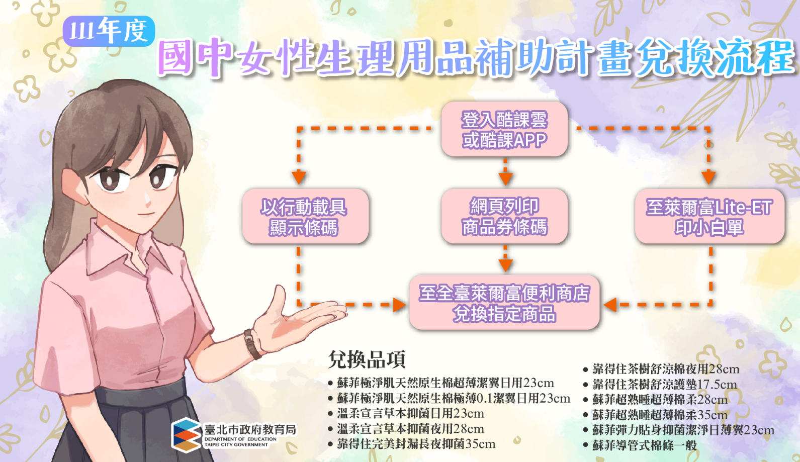 一、臺北市政府教育局111年9月7日起,每月派送本市國中女學生生理用品兌換券2張至酷課雲或酷課APP,提供學生自行至全臺萊爾富兌換生理用品。