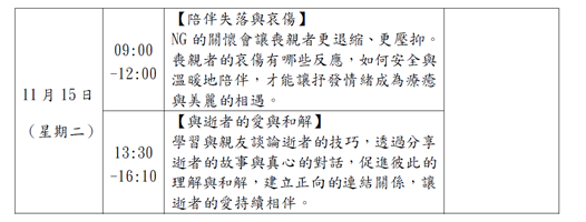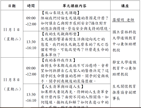課程日期:111年11月1日、8日、15日(星期二)共3天。上 午9時至下午4時10分。合計18小時。(須全程參與)。