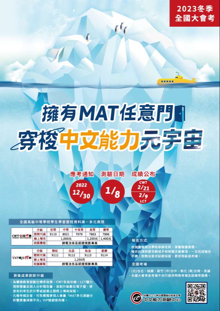 一、「CWT全民中檢」、「LCT中文聽力理解檢定」為全國唯一 通過教育部民間推薦採認之中文類證照,亦於「全國高級 中等學校學生學習歷程資料庫」認列為多元表現之證明, 將有助貴校學生升學備審。證照代碼如下: 甲、CWT全民 中檢證照代號: 初等9110、中等8021、中高等7979、高等 7863及優等7896 乙、LCT中文聽解證照代號: 酷紅級 9111、白金級9112、鈦金級9113及星鑽級9114