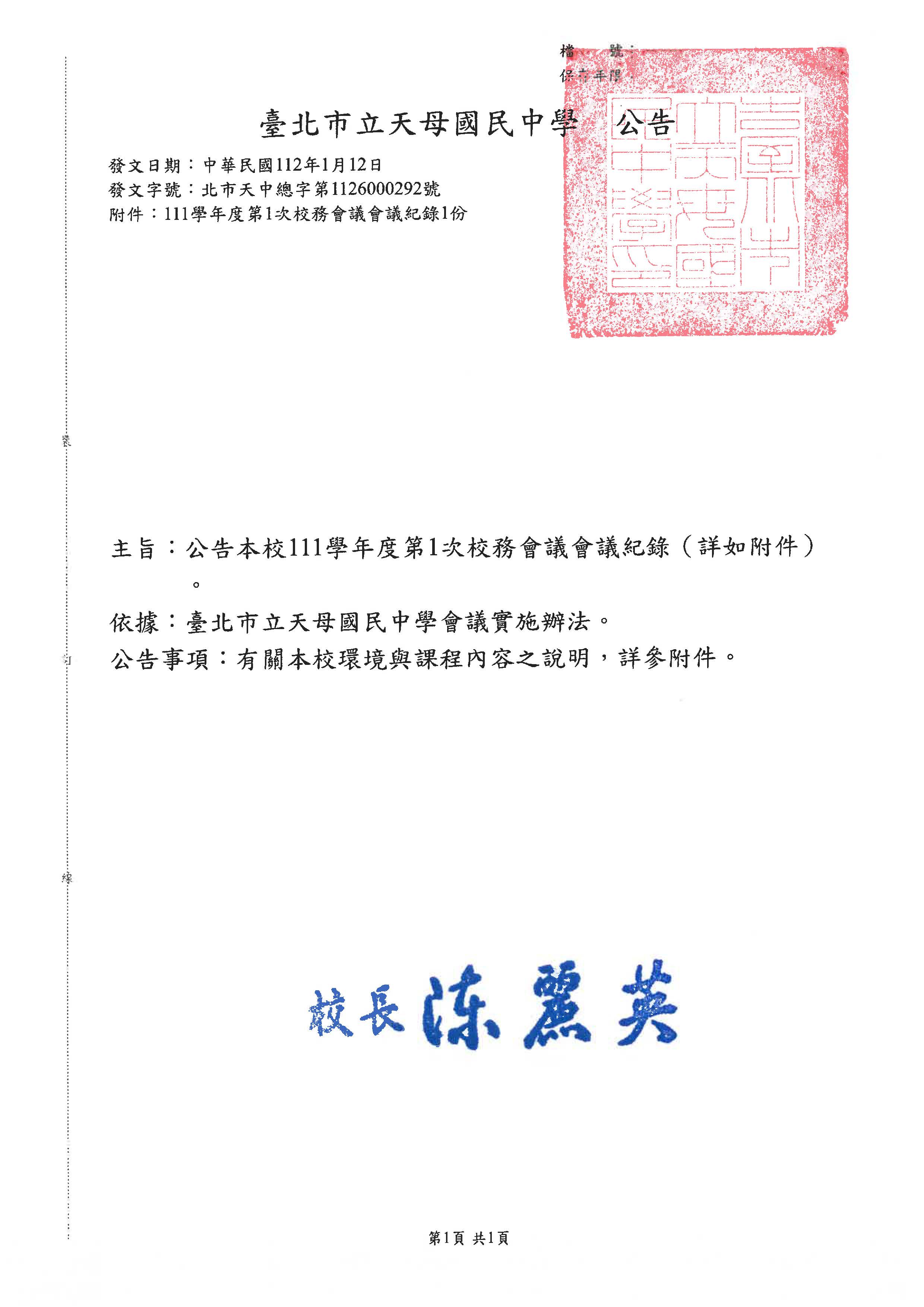 公告本校111學年度第1次校務會議會議紀錄暨會議議決事項(詳如附件)。