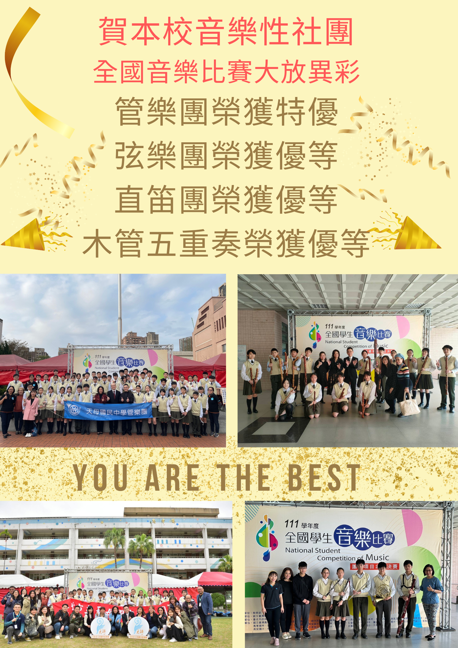 本校音樂性社團:管樂團榮獲全國音樂比賽特優、弦樂團榮獲優等、直笛團榮獲優等、木管五重奏榮獲優等。
