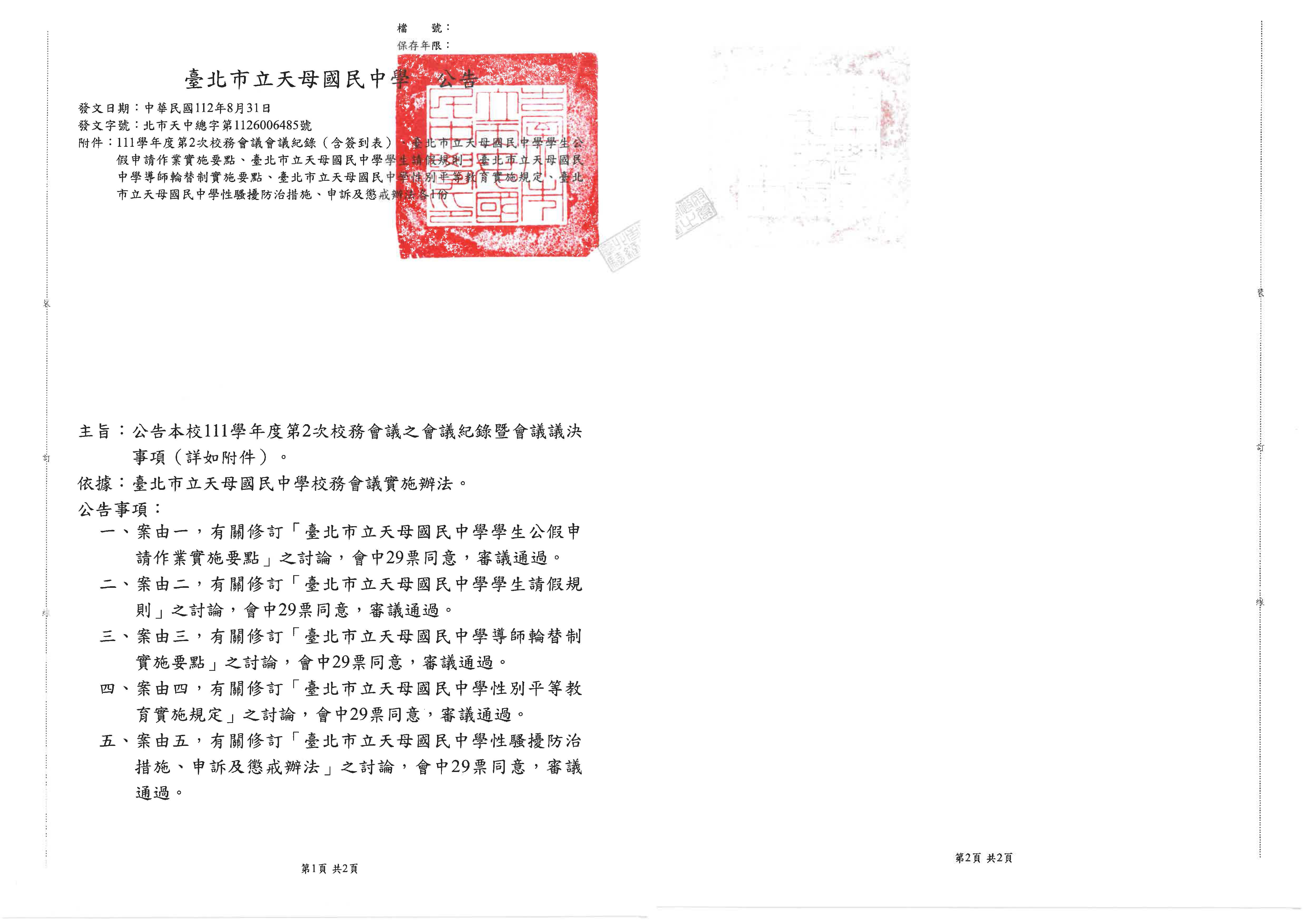 公告本校111學年度第2次校務會議會議紀錄暨會議議決事項(詳如附件)。