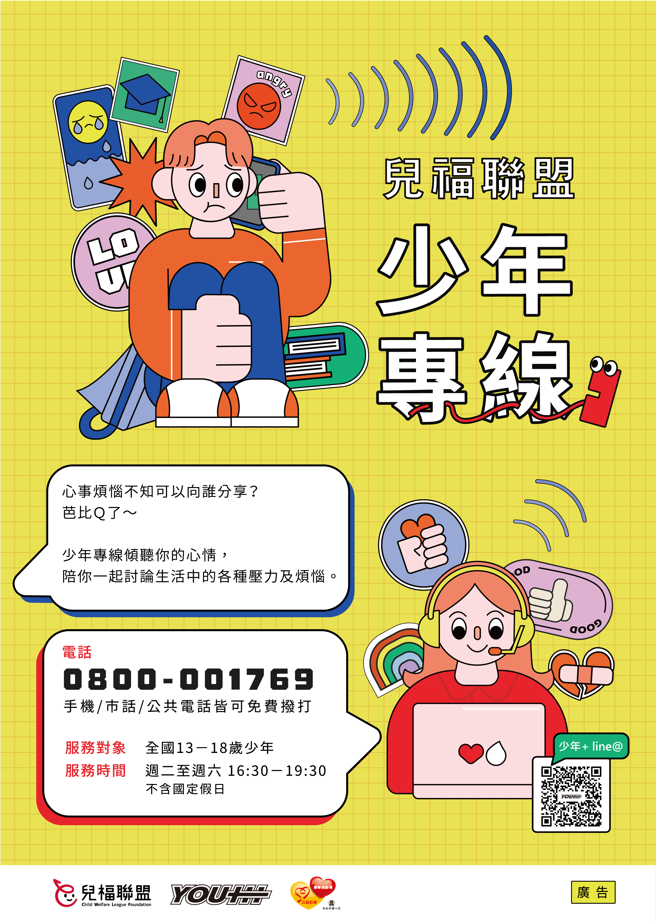 期待透過此專線傾 聽少年的需求,協助其抒發壓力,並引導、陪伴他們面對 和解決困難。