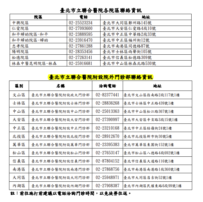 為方便民眾接種,規劃臺北市立聯合醫院12區院外門診部(名冊如附件)自112年12月30日至113年1月27日(113年1月13日選舉日除外)加開週六上午疫苗專診,提供公費流感疫苗及COVID-19疫苗接種,並免收掛號費。