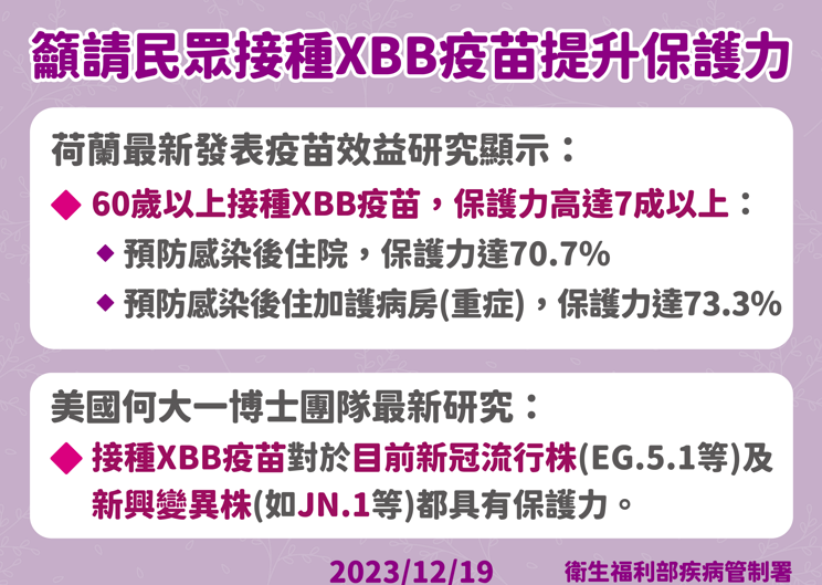 新冠疫情升溫,病毒持續演變,新冠XBB疫苗對於現階段變異株均有保護力,可降低感染後重症及死亡風險,提醒出生滿6個月以上民眾請儘速接種新冠XBB疫苗,提升免疫保護力,保護自己與他人。