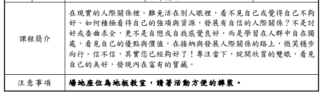 六、課程地點:實體課程於本中心教師希望心坊舉行,若改為 線上課程,將以Google Meet平台進行。