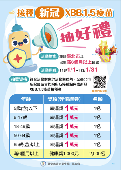 凡設籍臺北市市民於113年1月1日至1月31日期間接種新冠 XBB.1.5疫苗者,均符合活動抽獎資格。得獎名單將於113 年2月29日前公告於本局官網,得獎者須於113年3月1日至4 月8日期間,攜帶身分證件至戶籍所在地之健康服務中心或 指定地點領獎並完成具領文件簽署。