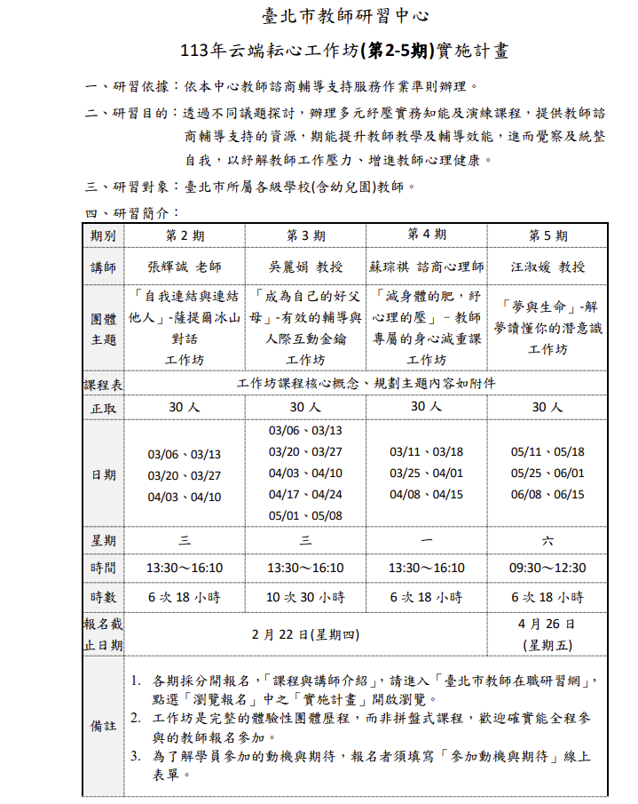 三、參加對象、人數:本市所屬各級學校(含附設幼兒園)教 師,每期工作坊30人。