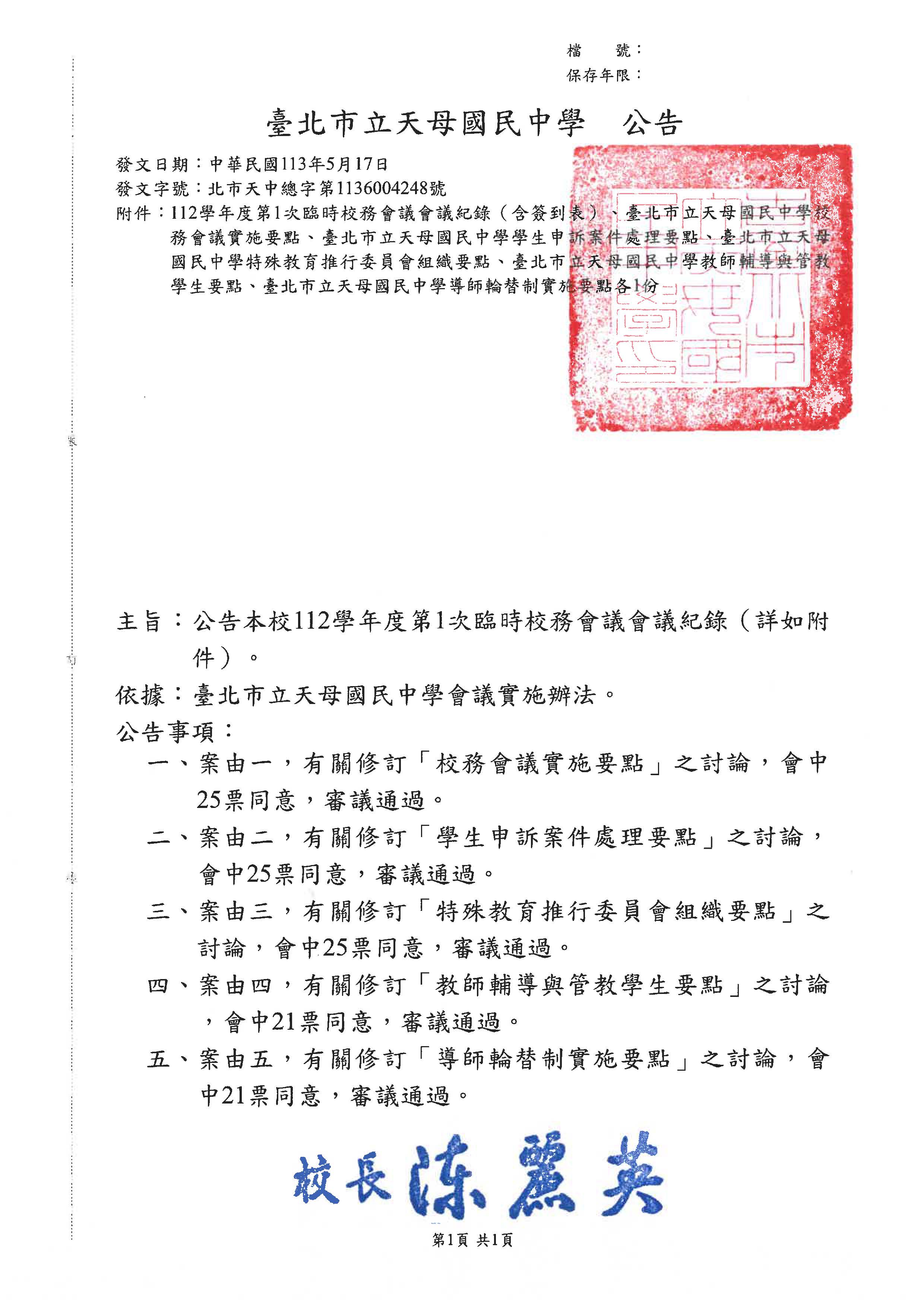 公告本校112學年度第1次臨時校務會議會議紀錄暨會議議決事項(詳如附件)。