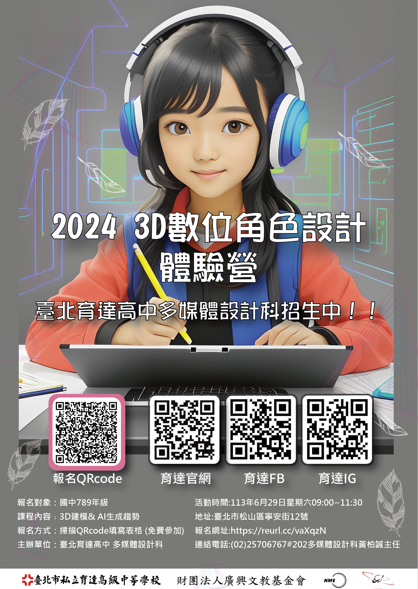 一、「3D數位遊戲藝術」為勞動部全國技能競賽職種,育達高中4年來協助培訓3D職種榮獲多項佳績,本次活動找來3D動畫師,歡迎國中生來體驗!!