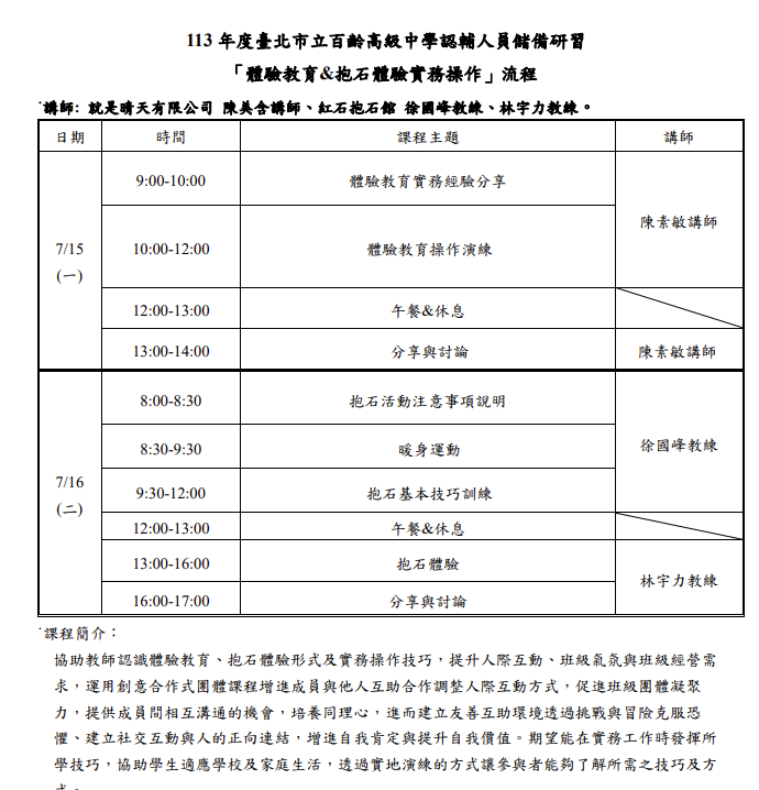 研習主題:113年度認輔人員儲備研習-體驗教育及抱石體 驗實務操作。