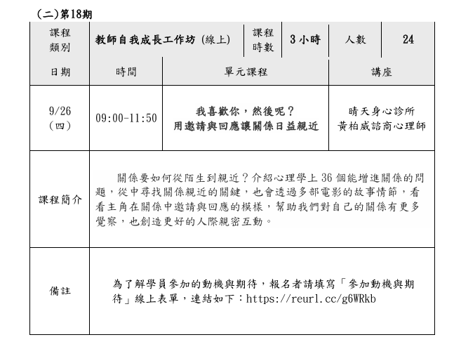 2、第18期:9月26日(星期四),半日線上課程,自上午9時至11時50分。