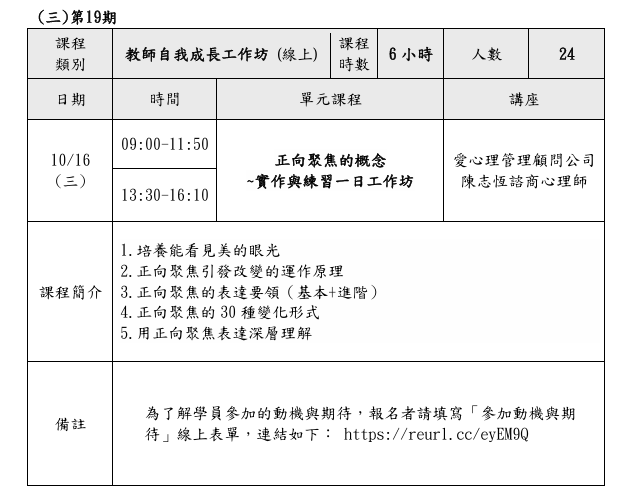3、第19期:10月16日(星期三),全日線上課程,自上 午9時至16時10分。