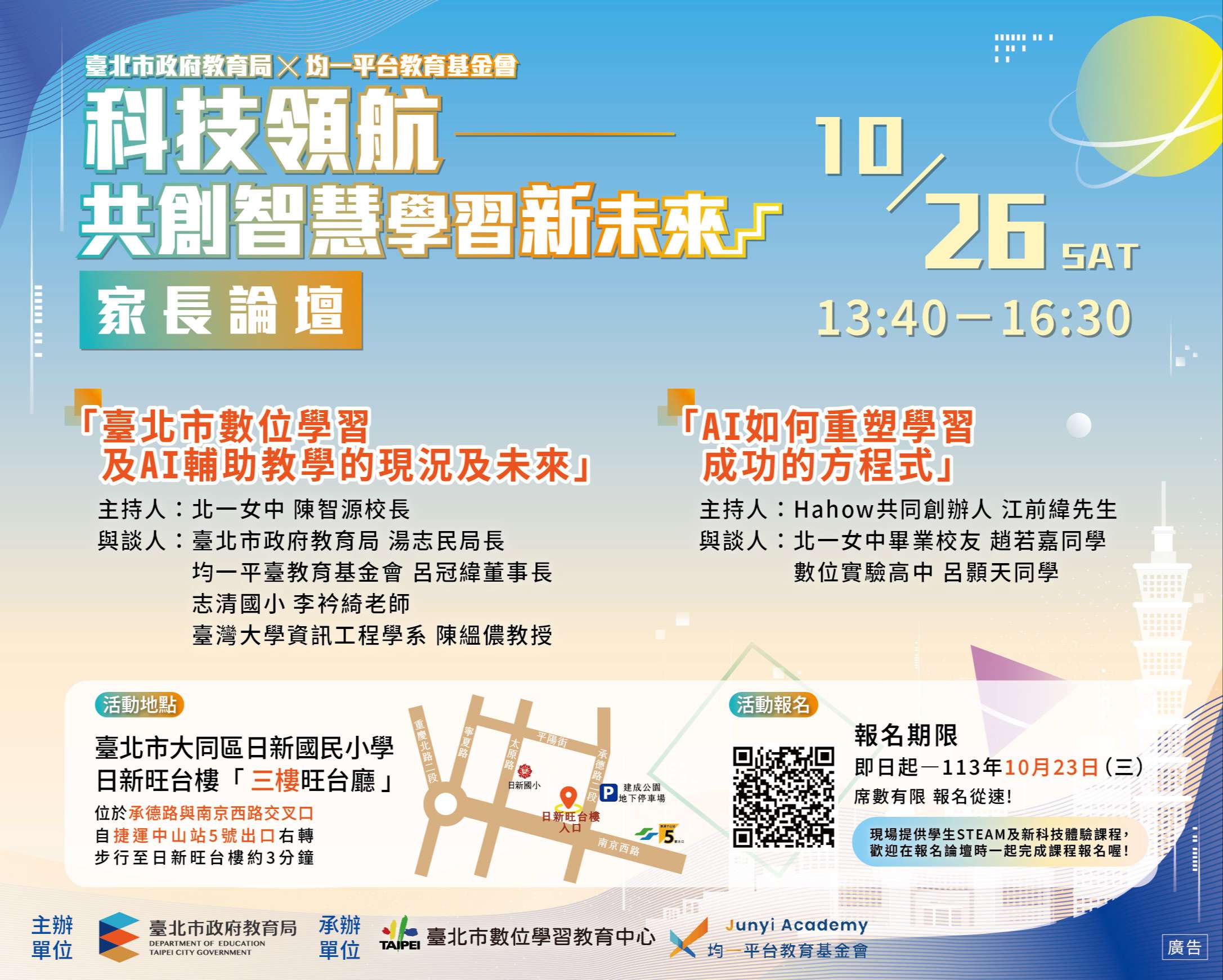 活動地點:臺北市大同區日新國民小學日新旺台樓(位 於承德路與南京西路交叉口,自捷運中山站5號出口右轉 步行至日新旺台樓約3分鐘)。