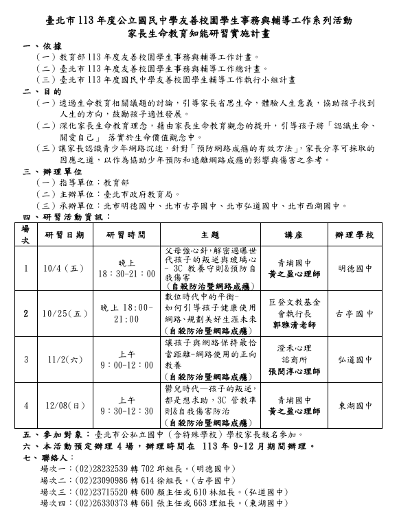3、聯絡人:古亭國中輔導室徐組長,連絡電話:02- 23090986分機614。