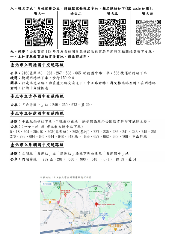 3、聯絡人:東湖國中輔導室張主任或理組長,連絡電 話:02-26330373分機 661或分機663。