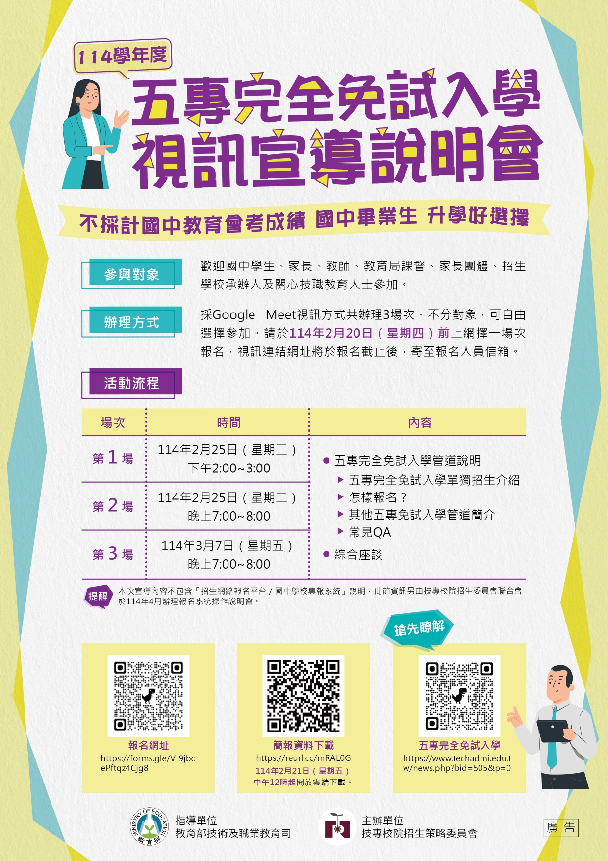 一、五專升學進路「完全免試入學」單獨招生管道,114學年度試辦第2年,無須國中教育會考成績,適性選擇,升學進路更多元。為協助親師生瞭解五專完全免試入學管道的特性、重要時程及積分採計項目等內容,特辦理旨揭說明會。