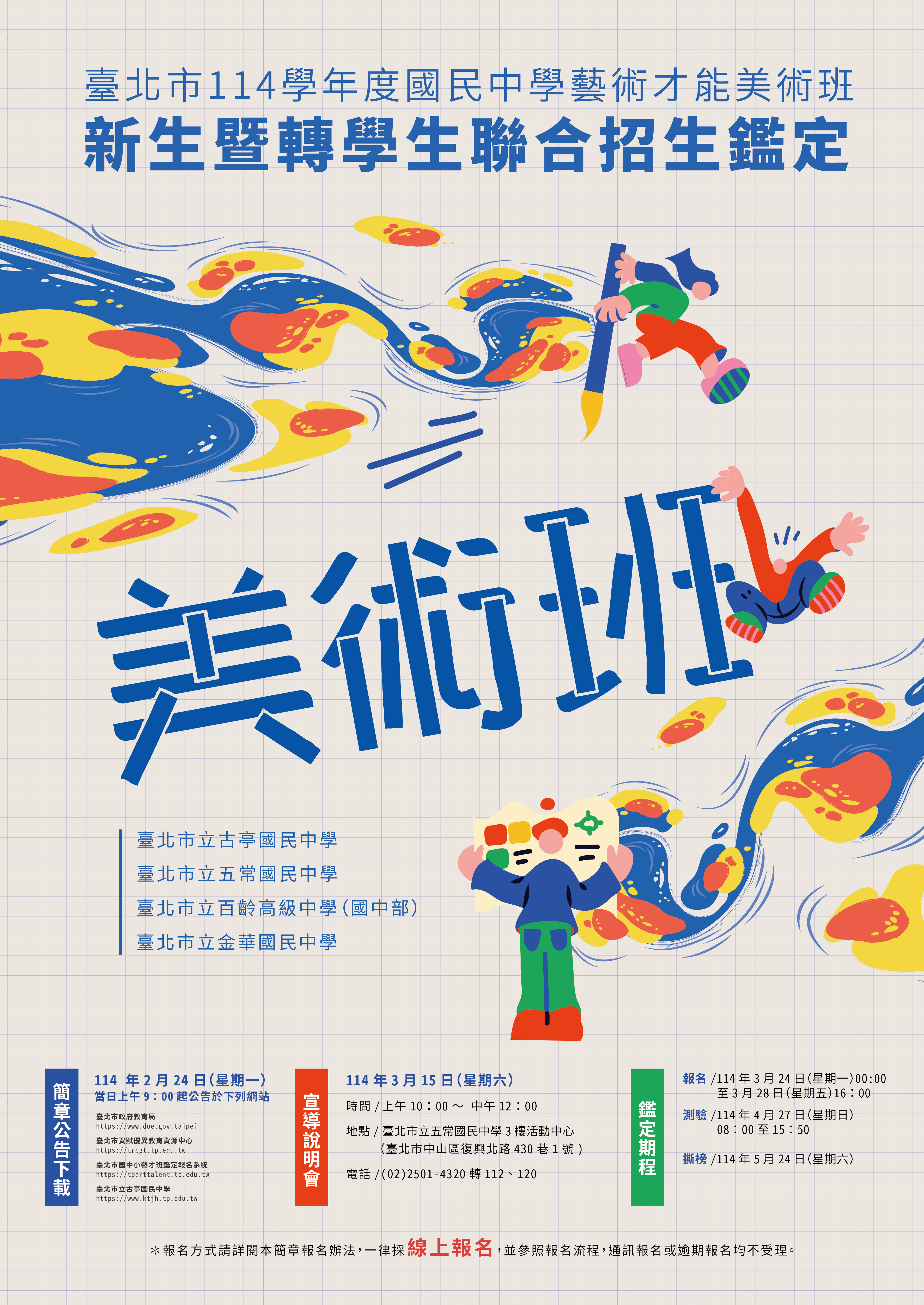 114學年度招生鑑定報名自114年3月24日(星期一)0:00至3月28日(星期五)16:00,3月15日宣導說明會,4月27日測驗,5月24日撕榜,詳情請參閱簡章。