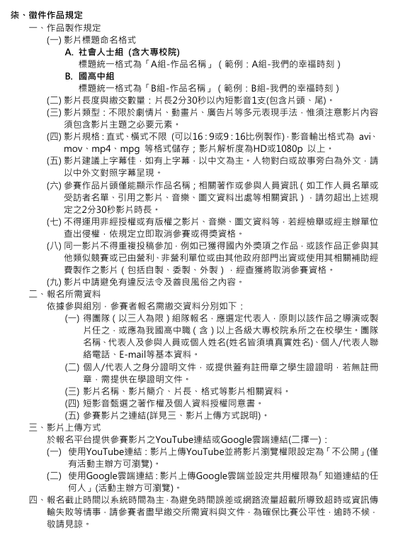 (二)徵件主題:參賽者分享人際交往時打動人心的幸福時 刻,拍攝成短影音,須結合教育部、衛福部、勞動部等 相關福利政策資訊。