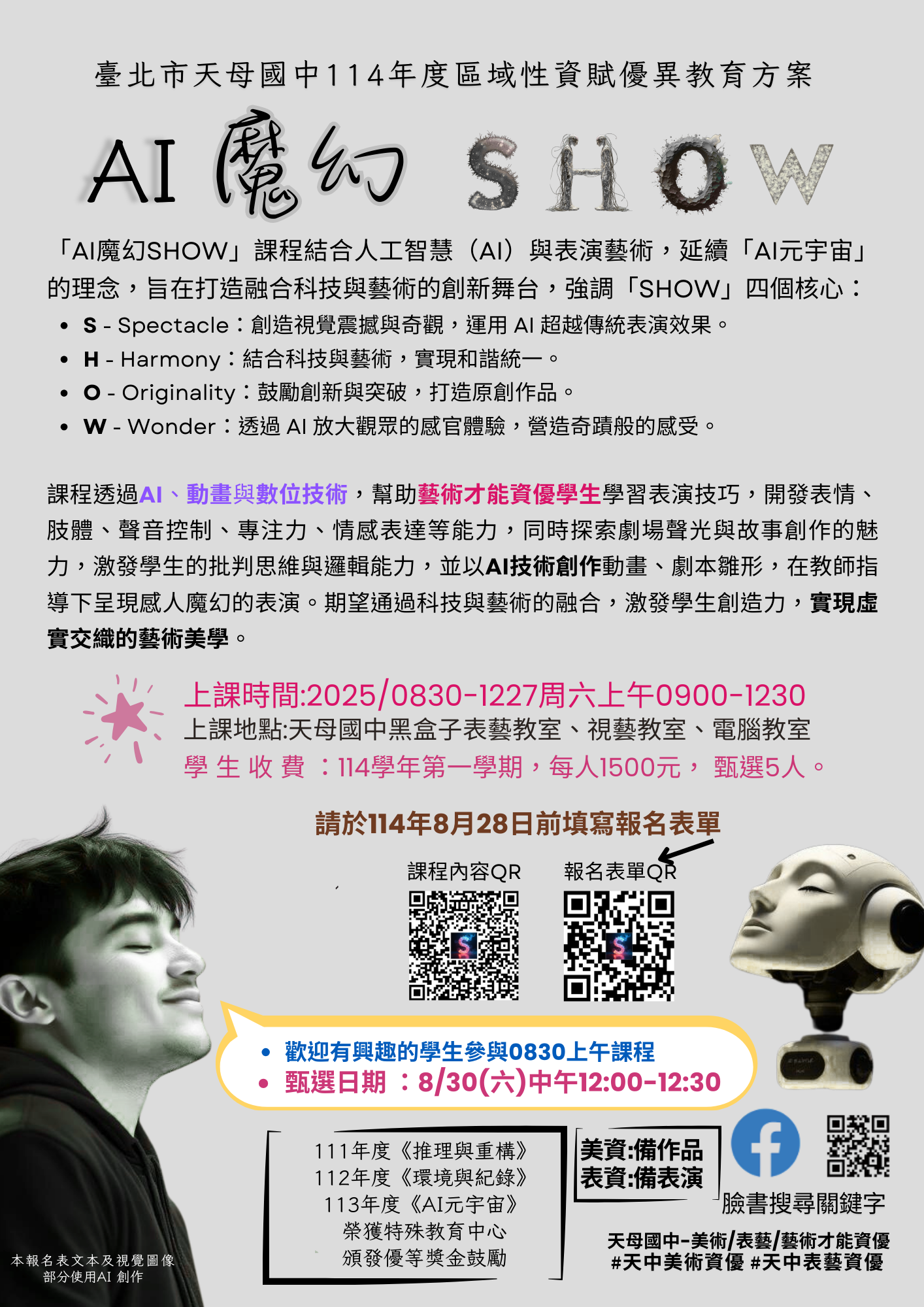 課程透過AI、動畫與數位技術,幫助藝術才能資優學生學習表演技巧,開發表情、肢體、聲音控制、專注力、情感表達等能力,同時探索劇場聲光與故事創作的魅力,激發學生的批判思維與邏輯能力,並以AI技術創作動畫、劇本雛形,在教師指導下呈現感人魔幻的表演。期望通過科技與藝術的融合,激發學生創造力,實現虛實交織的藝術美學。