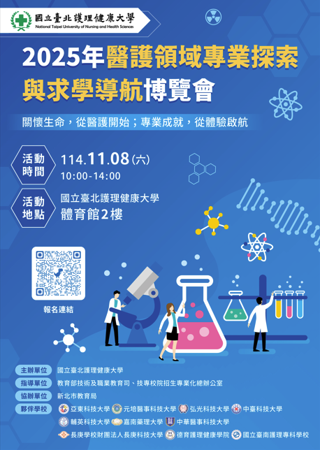 說明: 一、隨著社會人口結構的改變,高齡化社會的來臨,醫護人才的需求日益增加。為了促進醫護人才的培養,推動醫護產業的發展,特辦「2025年醫護領域專業探索與求學導航博覽會」,以整合醫護領域各校資源,促進產學交流與合作,提供學生多元的升學選擇,繼而宣導醫護產業並提升學生對醫護領域的興趣。