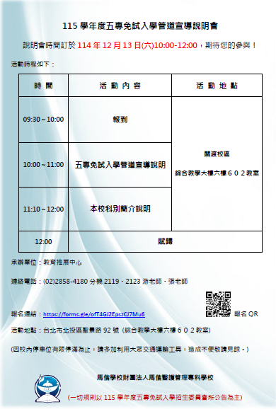 主旨:為增進國中九年級學生及家長對五專升學管道之認識,馬偕學校財團法人馬偕醫護管理專科學校特規劃辦理五專免試入學管道宣導說明會,協助學生探 索興趣與潛能,以作為生涯規劃之參考,敬請協助惠予公告周知。