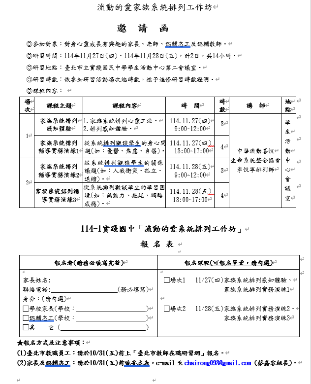 四、報名方式:家長請於114年10月31(五)前來信報名 (chairong093@gmail.com蔡嘉容組長),教師請上臺北市在 職研習網報名。