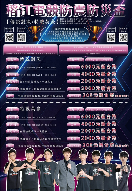 臺北市私立稻江高級商業職業學校辦理2025「稻江電競特戰英豪 防震防災盃」電競大賽,請協助公告,歡迎同學踴躍組隊報名參加,報名相關辦法詳如附件說明,請查照。