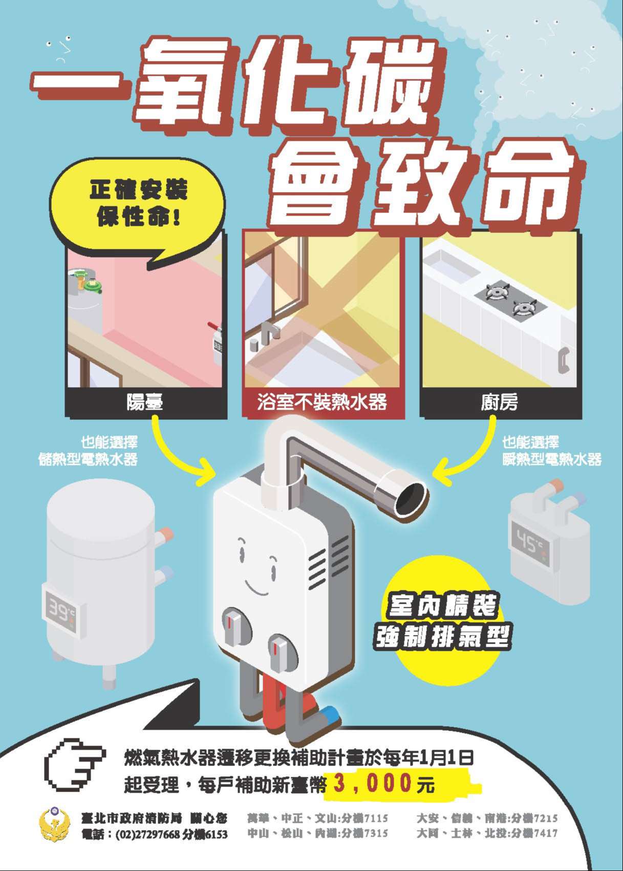 二、冬天是一氧化碳中毒的高峰期,為防範一氧化碳中毒,安裝燃氣熱水器要遵循「5要原則」,要保持環境通風、要注意定期檢修、要檢驗合格標示、要選擇正確型式、要注意安全安裝,以確保居家安全。