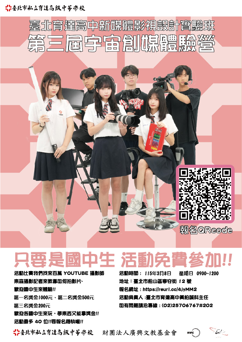 主旨:邀請貴校學生參加育達高中舉辦「第三屆宇宙創媒體驗營」,辦法如說明,歡迎學生參加。