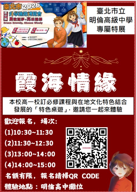 一、明倫高中參與115年3月21日臺北市2026年高中職升學進路博覽會,為展現學校特色課程,除文宣資料及成果展示外,特 於攤位設置「霞海情緣」特展,內容為本校高一校訂必修 課程結合大稻埕在地文化所發展之特色桌遊,敬邀貴校學生參與體驗。